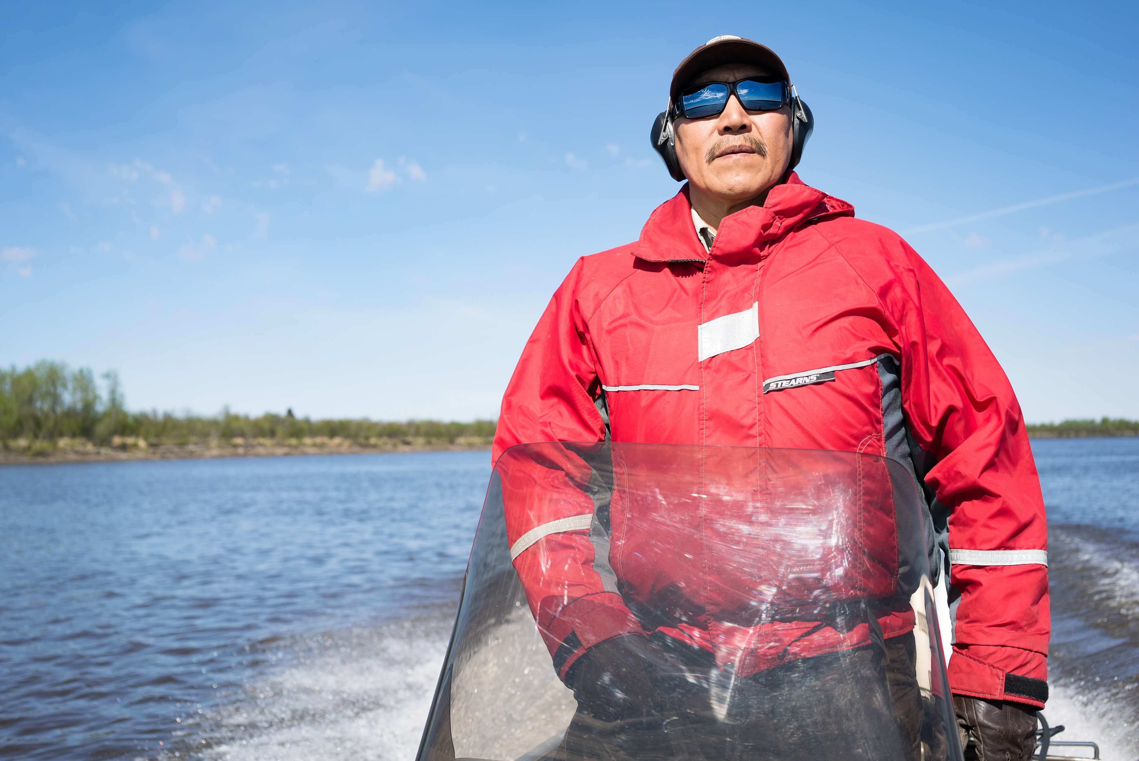 Christopher Tulik drives a boat along the Kuskokwim River, Alaska