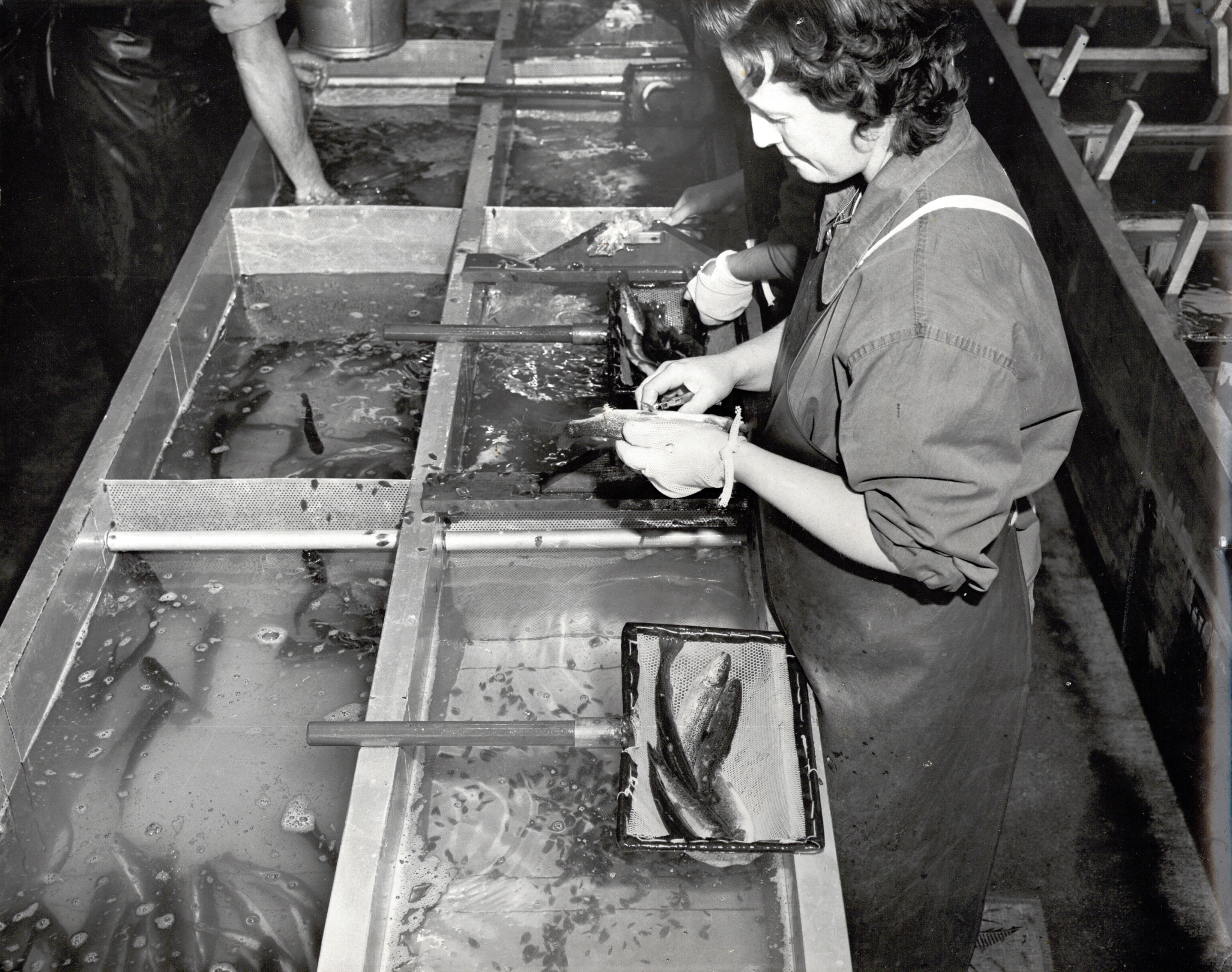 To mark hatchery fish, fins are often clipped. This was done by hand in the past, offering seasonal work to women as well as men.