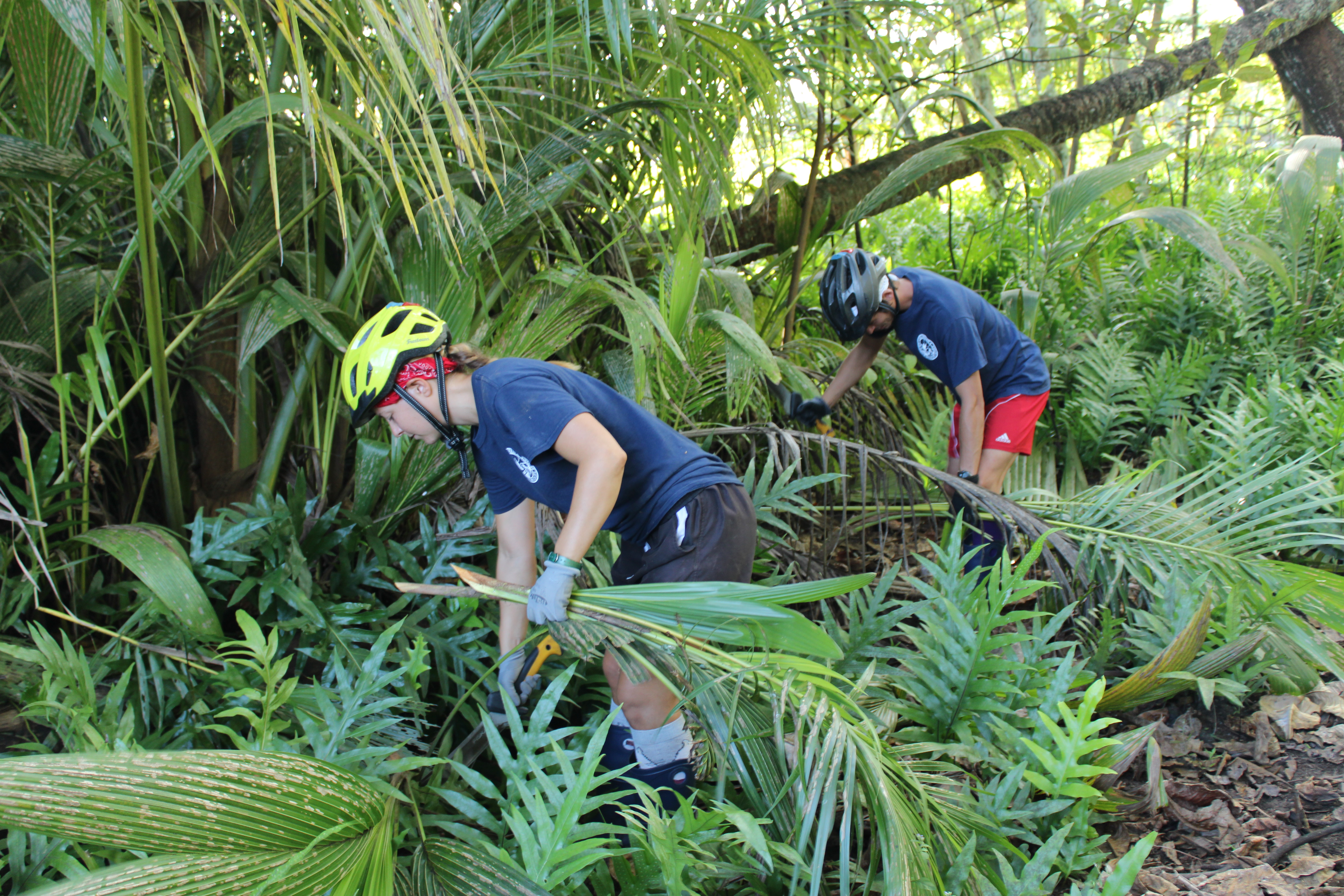Coconut control volunteers clear juvenile coconut palms, leaving the native ferns to flourish.