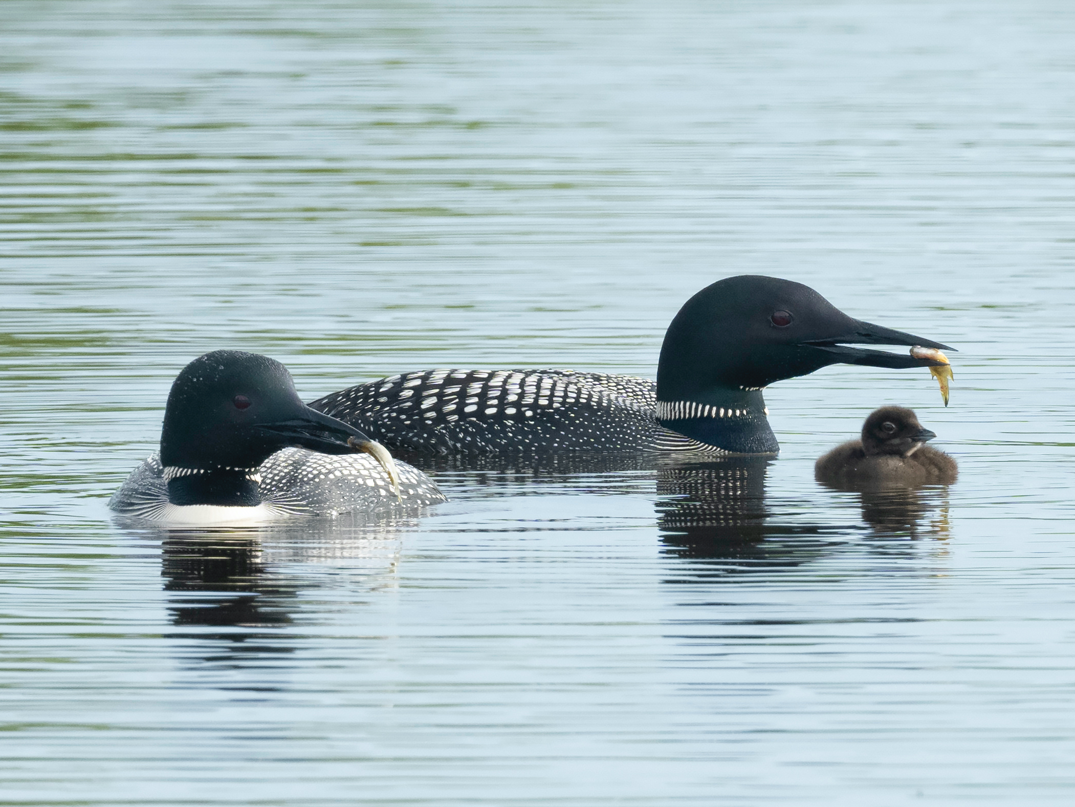 The pair of oldest known common loons offer small fish to their young.
