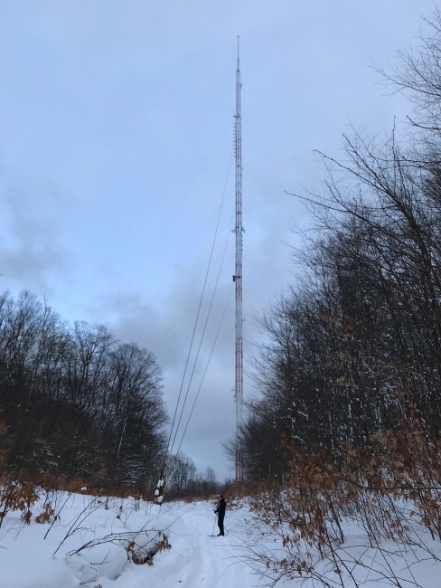 This communication tower on the U.S. Forest Service Huron-Manistee National Forest in Michigan was the very first tower to change its lights from non-flashing to flashing to help prevent birds from colliding with it.