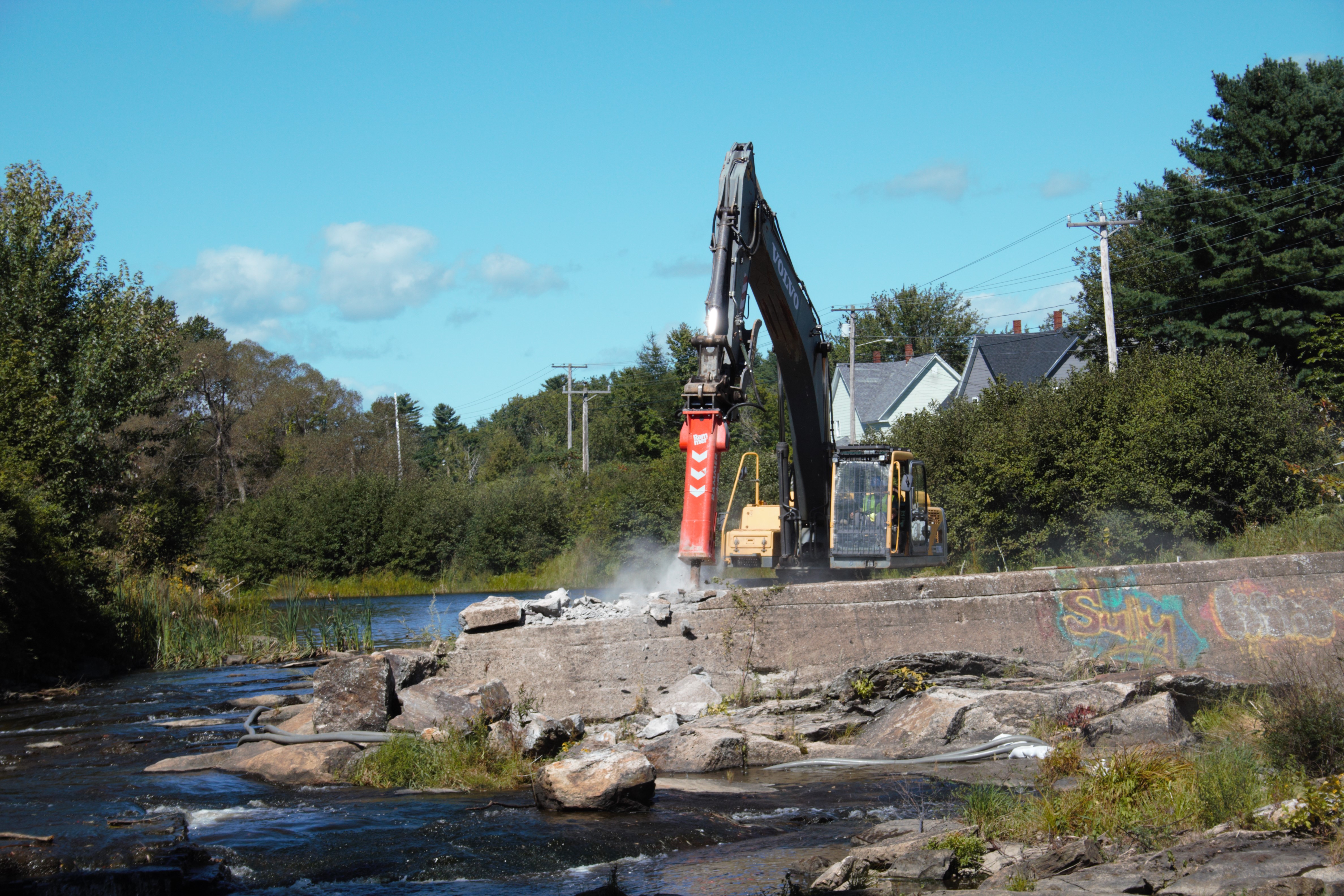 Construction crews demolishing Town Dam on the Sabattus River in Maine