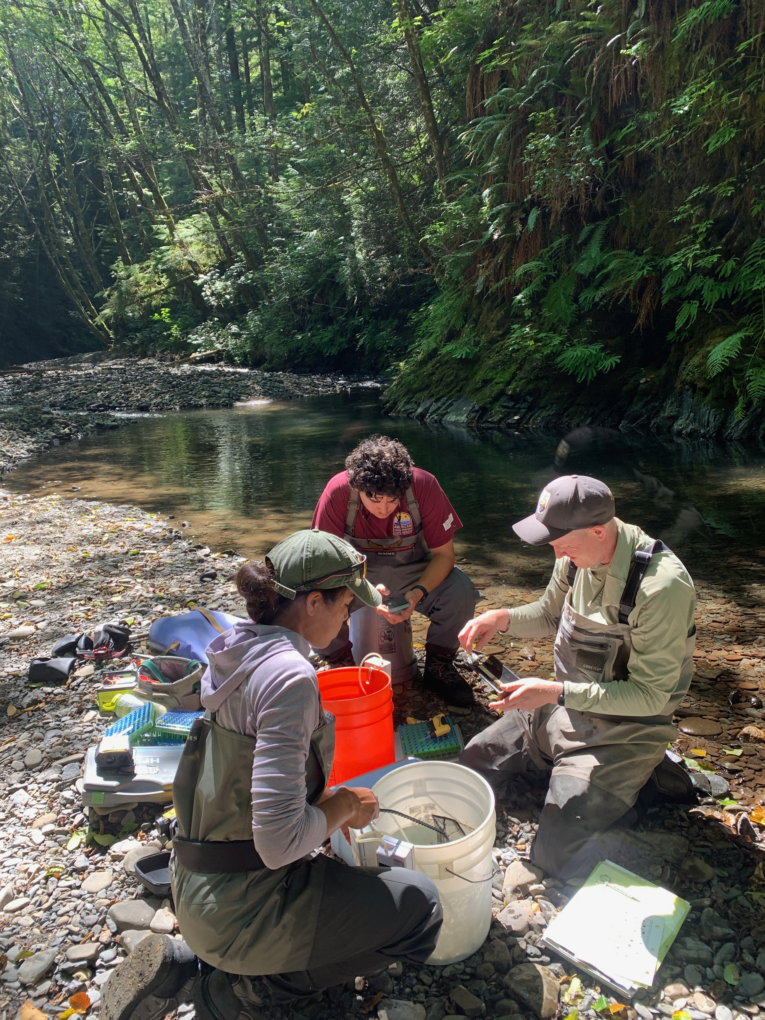 Field crew collecting species, length, and weight data prior to tagging and release.