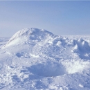 An empty polar bear den viewed from the snowy surface, with an excavated exit hole and bear tracks, made by the bears when they departed.