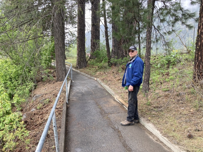 Former hatchery manager and current member of Trout Unlimited Dan Davies poses on the newly cleaned accessible trail to the fishing platform.