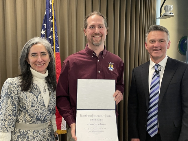 Dan Spencer (center) receives Department of the Interior Meritorious Service Award for his outstanding work in education, outreach, and internship programs in the Pacific Region Fish and Aquatic Conservation Program. Spencer received the award at a Pacific Region recognition event, and is pictured here with Deputy Regional Director Bridget Fahey (left) and Regional Director Hugh Morrison (right).