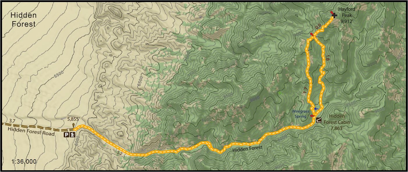The route to Hidden Forest Cabin, and eventually to the summit of Hayford Peak is strenuous. Expect thousands of feet in elevation change, loose footing, and unpredictable weather.