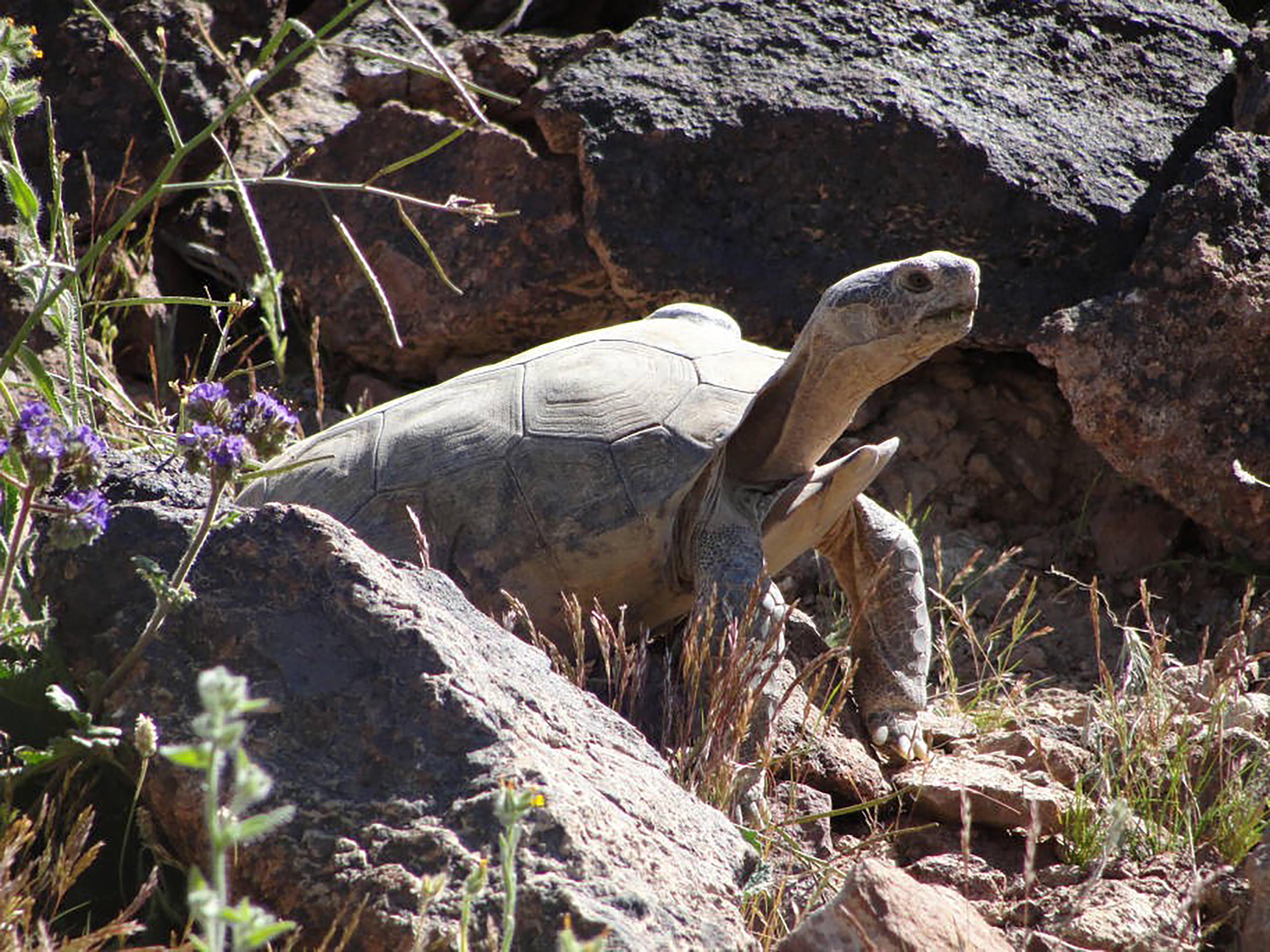 Mojave desert tortoise (Gopherus agassizii) live in burrows in valleys and in saltbush and Mojave Desert scrub habitats.