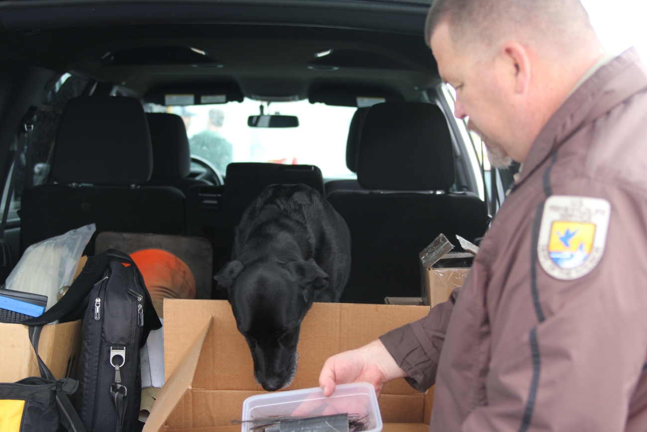 Dock and his handler opening a package containing whale baleen he detected during a training exercise at a parcel hub.