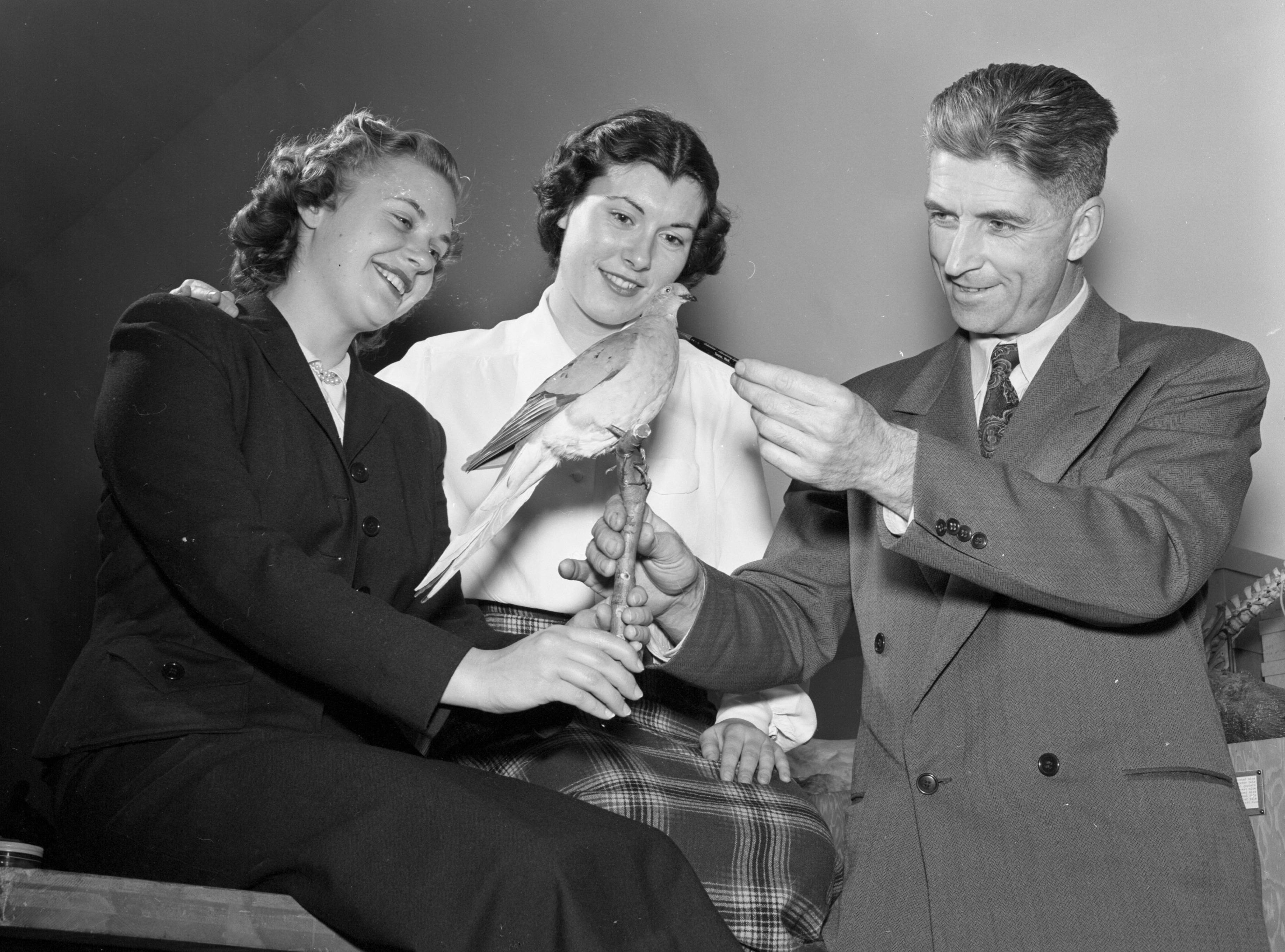 Biology Professor Gordon Alcorn and two unidentified students examine a natural history museum specimen in Howarth Hall, University of Puget Sound, 1951.