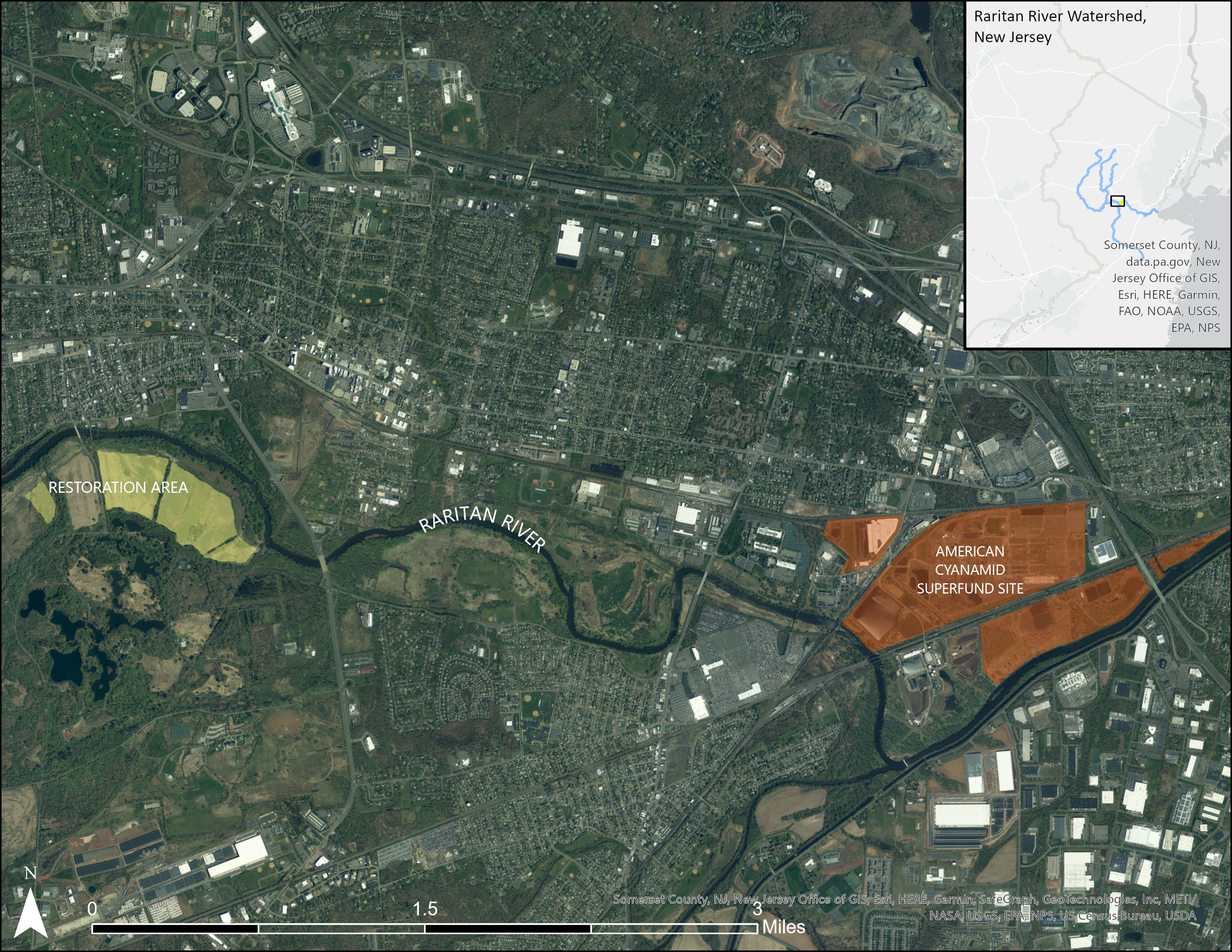 A map of the proposed restoration area, three miles upriver from the American Cyanamid Superfund Site along the Raritan River