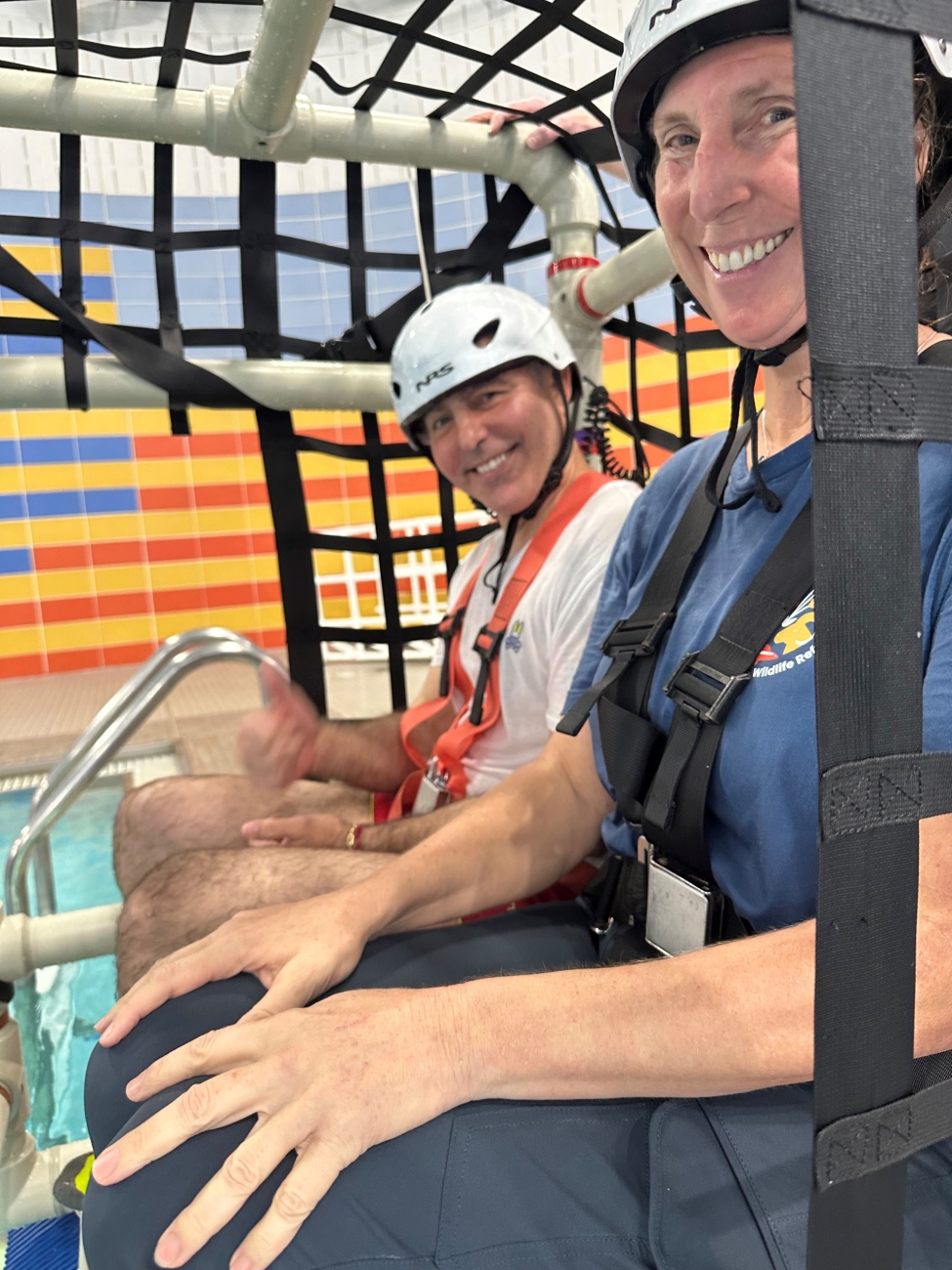 U.S. Fish and Wildlife Service Director Martha Williams belted into the cockpit simulator used to train Service personnel conducting overwater aerial missions or seaplane operations to safely egress from a flooded and inverted aircraft. A. Eric Alvarez, Deputy Chief, National Wildlife Refuge System, is to her right, as the two person crew in the simulated aircraft. Both successfully exited the simulated aircraft on their respective sides.