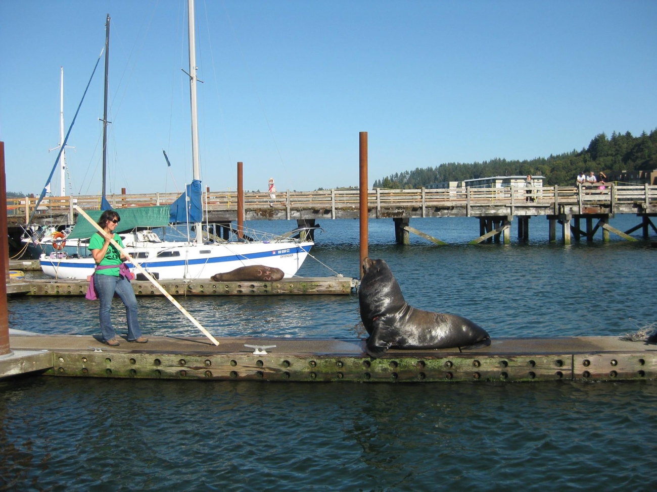 Lee helps flush sea lions off the docks in Astoria as part of the marking and monitoring program. Personal photo used with permission.