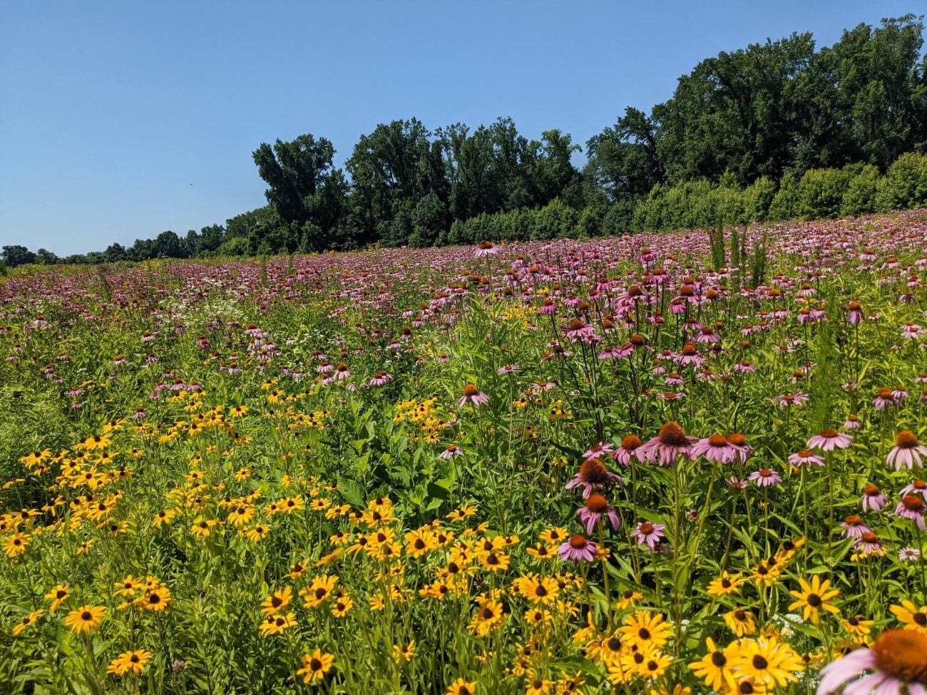 A field of purple cone flowers (echinachea) and black-eyed Susans blooms at Rappahannock River Valley National Wildlife Refuge in Virginia.