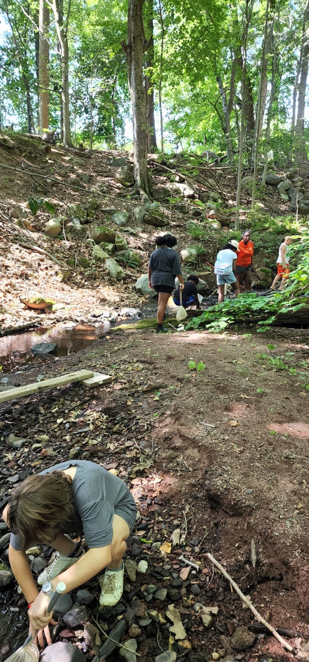Eco-campers walking along a wooded trail and exploring the woods of New Haven