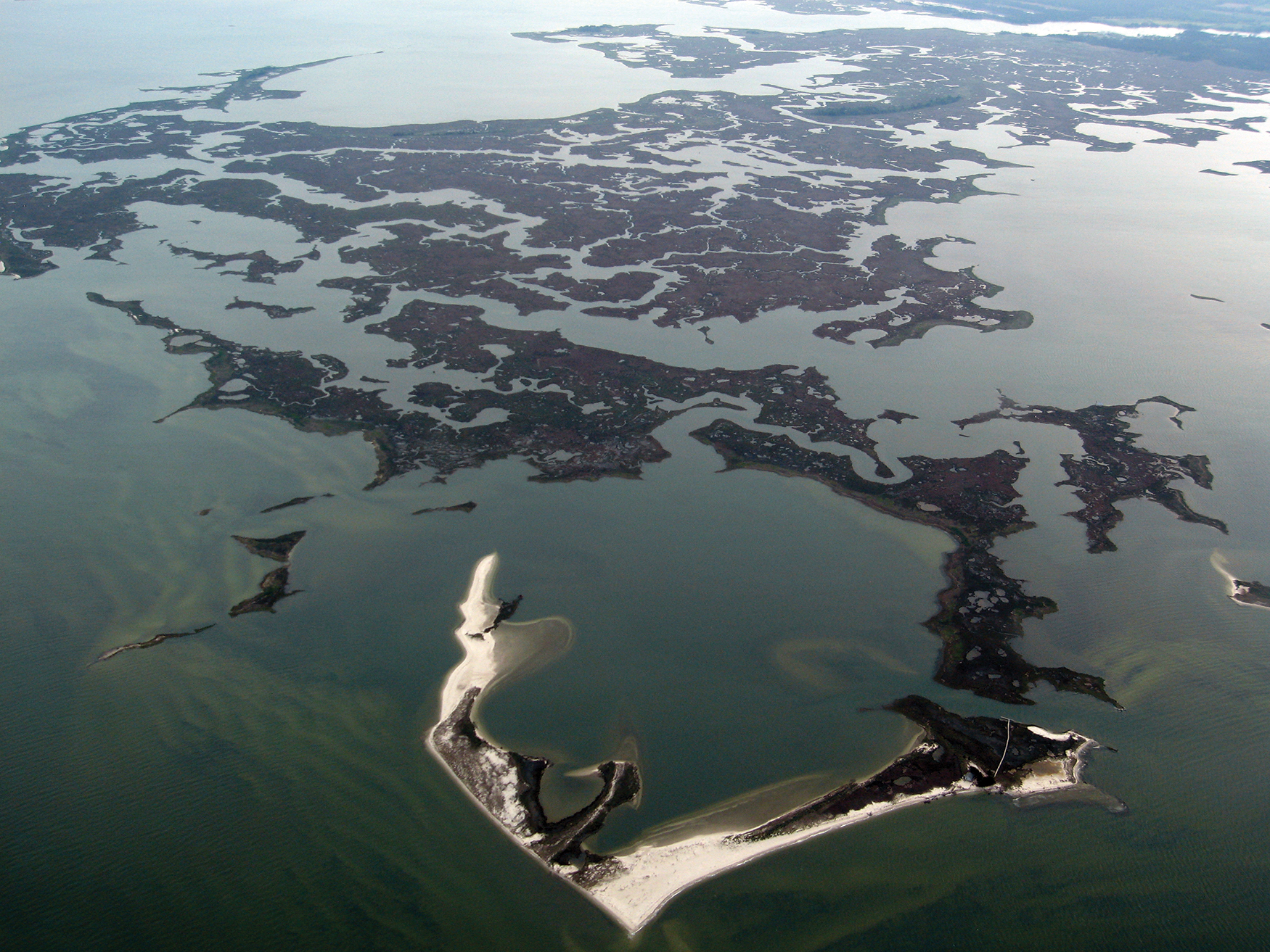 Aerial view of saltwater (intertidal) wetlands that include emergent salt marsh and non-vegetated shoals and sandbars (foreground). Atlantic coastline of Virginia, 2008.