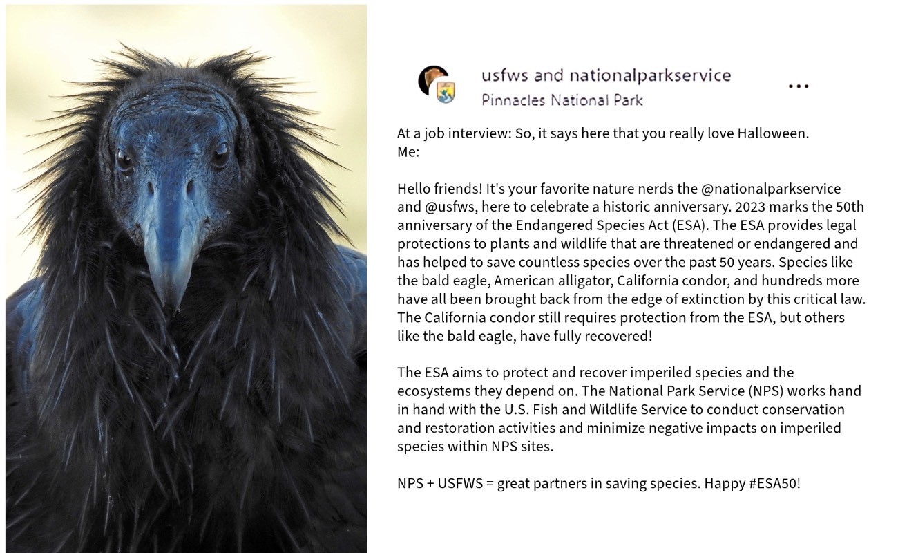 Hello friends! It's your favorite nature nerds the @nationalparkservice and @usfws, here to celebrate a historic anniversary. 2023 marks the 50th anniversary of the Endangered Species Act (ESA). The ESA provides legal protections to plants and wildlife that are threatened or endangered and has helped to save countless species over the past 50 years. Species like the bald eagle, American alligator, California condor, and hundreds more have all been brought back from the edge of extinction by this critical law. The California condor still requires protection from the ESA, but others like the bald eagle, have fully recovered!