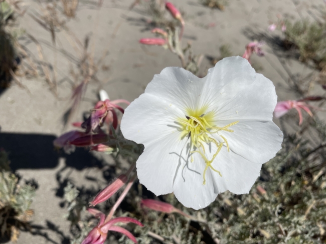 An endangered evening-primrose blooms in the sand at Antioch Dunes National Wildlife Refuge in California.