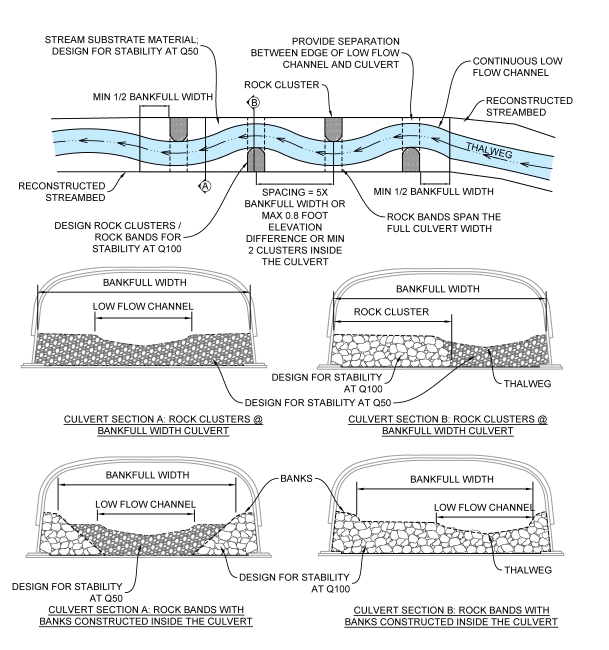 A plan view of a culvert with a stream channel running through it. Rock clusters and rock bands are depicted spaced at five times the bankfull width maximum or a maximum of 0.8 feet elevation difference between these structures. Rock clusters span the partial culvert width and rock band span the full culvert width. The rock bands and rock clusters are designed from material that's designed for stability at the 100-year flood flow. The channel substrate material is designed for stability at the 50-year flood flow. At least one half bankfull width is provided between the culvert inlet or outlet and a rock band or rock cluster structure.