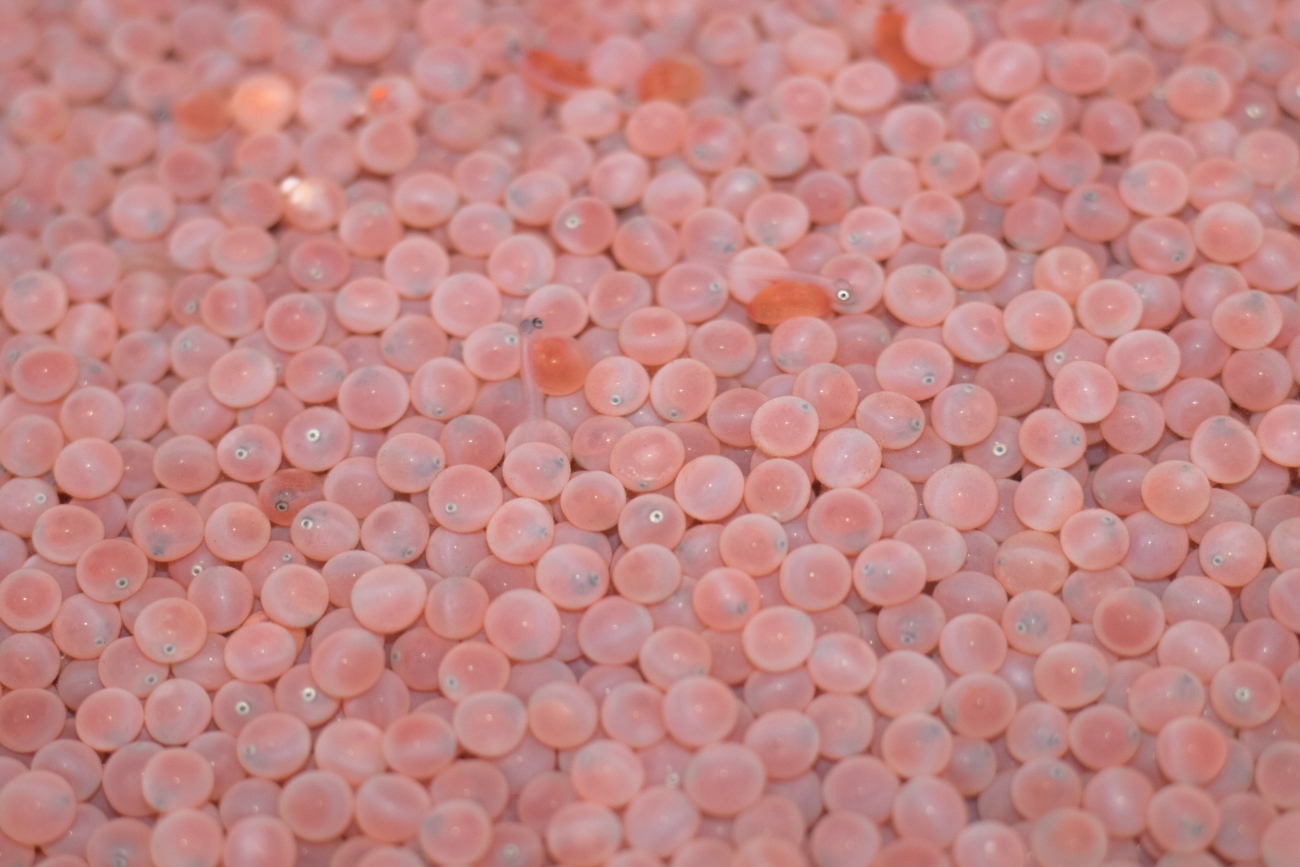 "Eye spy" Chinook salmon eggs ready for hatching! The eyes of the developing fish are visible through the shell of the egg. Look closely and you may spot a couple of recently hatched Chinook salmon with their egg still attached to their abdomen.