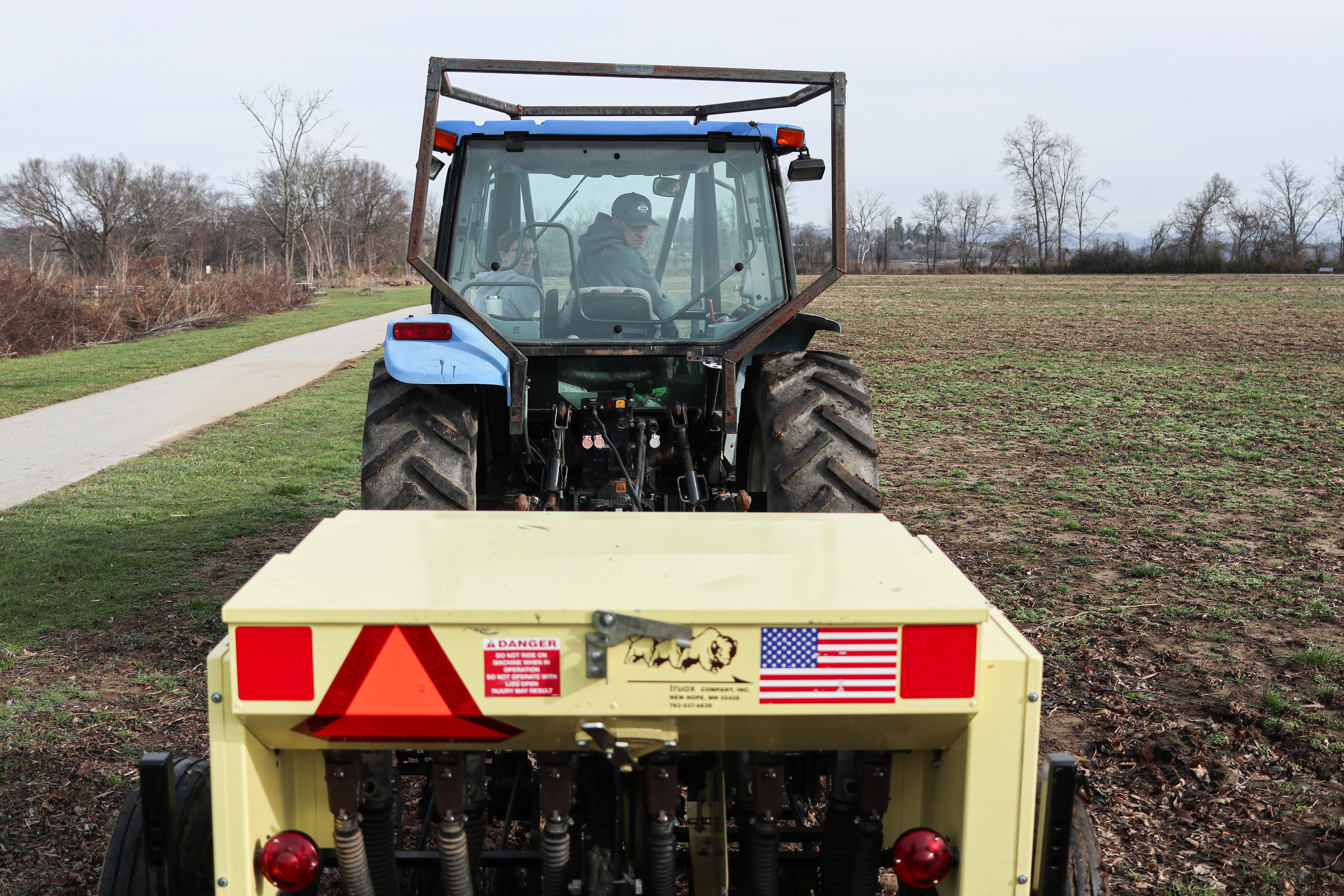 Kai Picciano and Wes Humphries look back at the seed drill from the cab of the tractor before starting to plant.