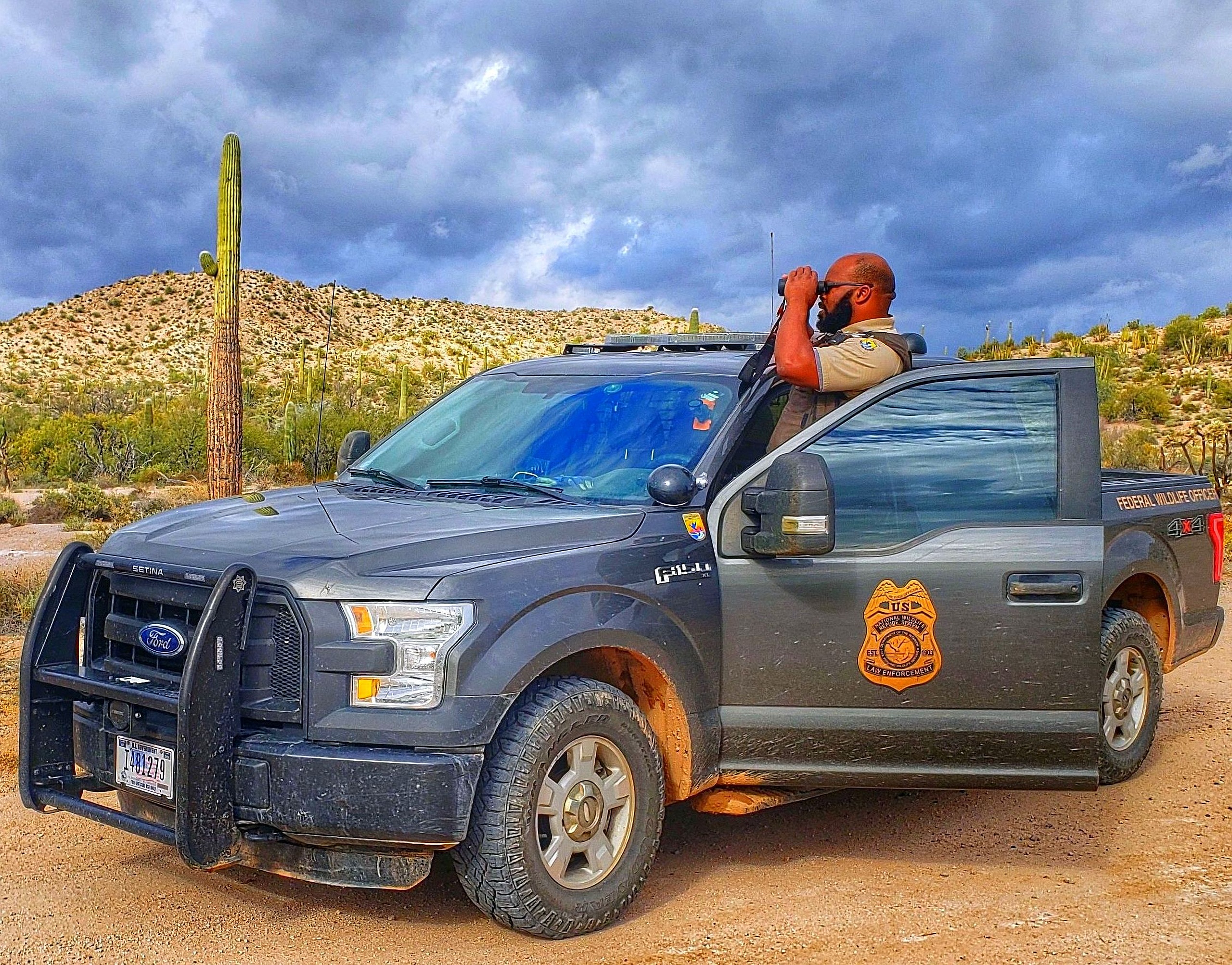 Federal wildlife officer Bruce Butler on the lookout at a national wildlife refuge in the Southwest.