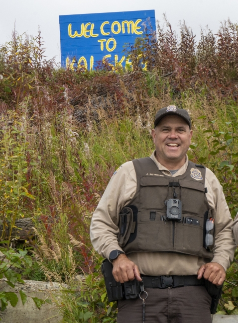 Senior Federal Wildlife Officer with the "Welcome to Kalskag" sign in Upper Kalskag, located along the Kuskokwim River, Alaska.