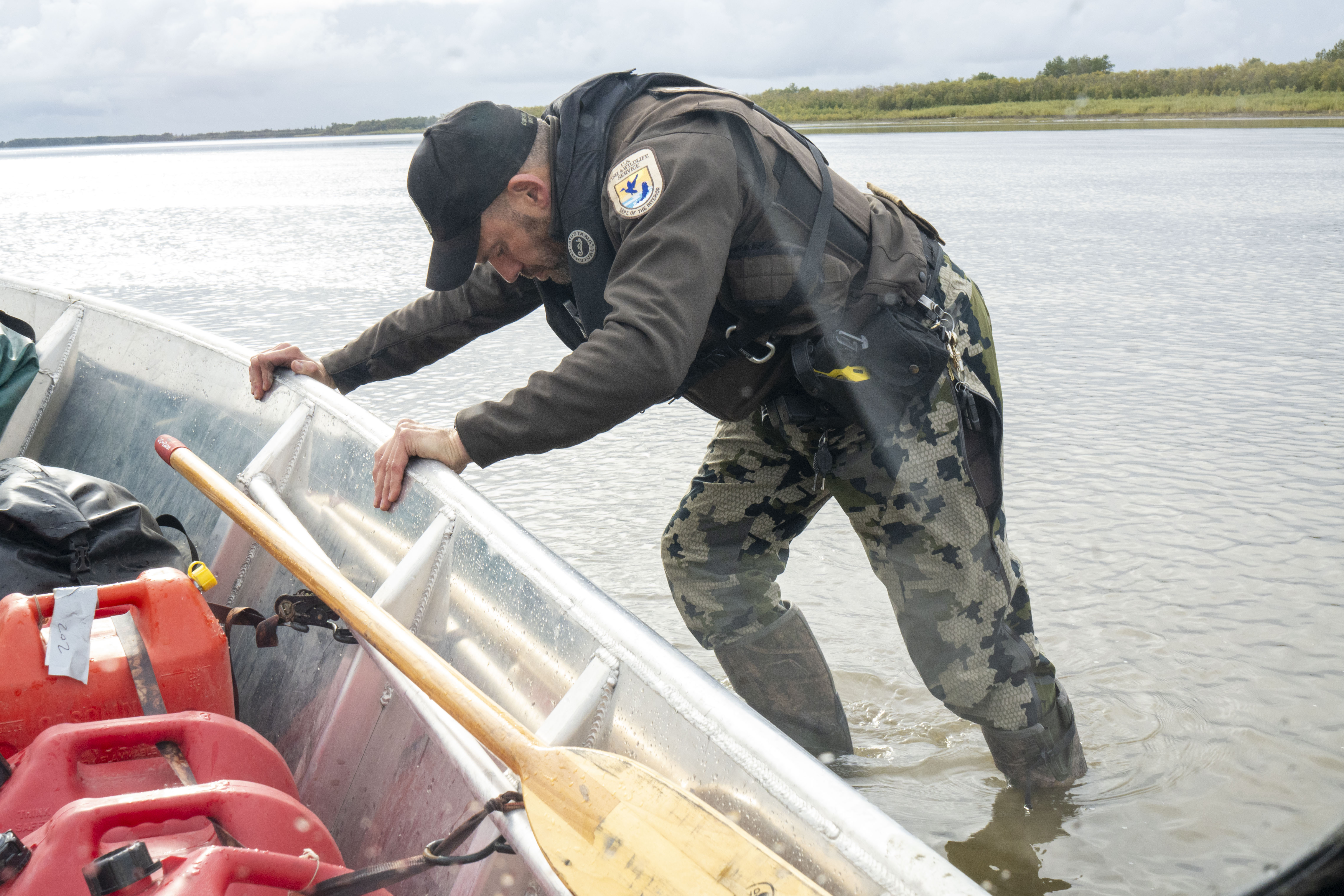 Following previous GPS tracks are not fool proof. Dynamic waters throughout the year always give the opportunity to run aground. Senior Federal Wildlife Officer Matthew McDonald experiences this as he pushes his patrol boat off a gravel bar in the middle of the Kuskokwim River, AK.