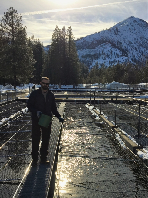 Hatchery staff feed fry in outdoor raceways at Leavenworth NFH