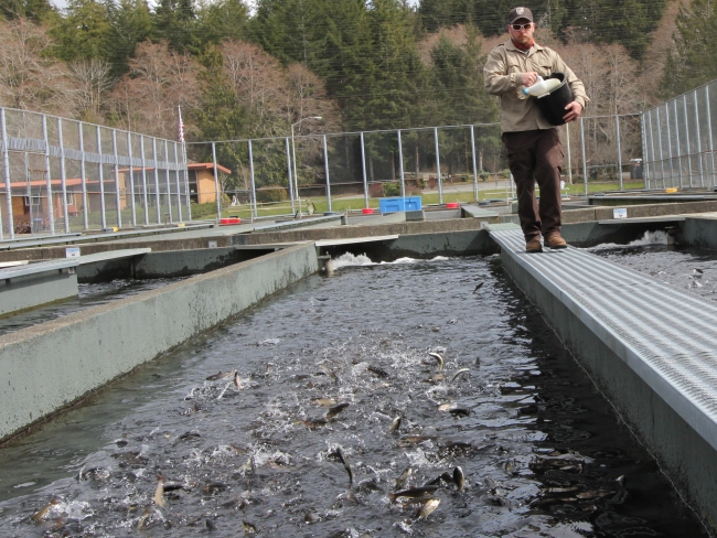 Quinault National Fish Hatchery staff feeding steelhead fry in raceway (concrete tank).