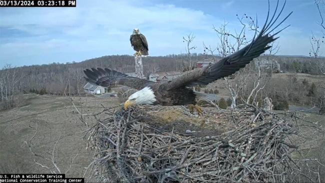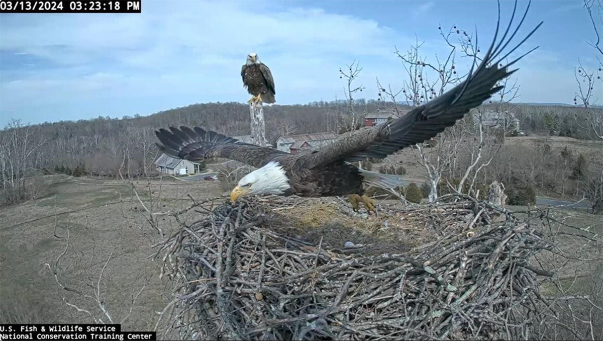 Screenshot from the NCTC Eagle Cam showing a female eagle with her 7 ft. wingspan taking off. Her wingspan is about the same length as the nest diameter.