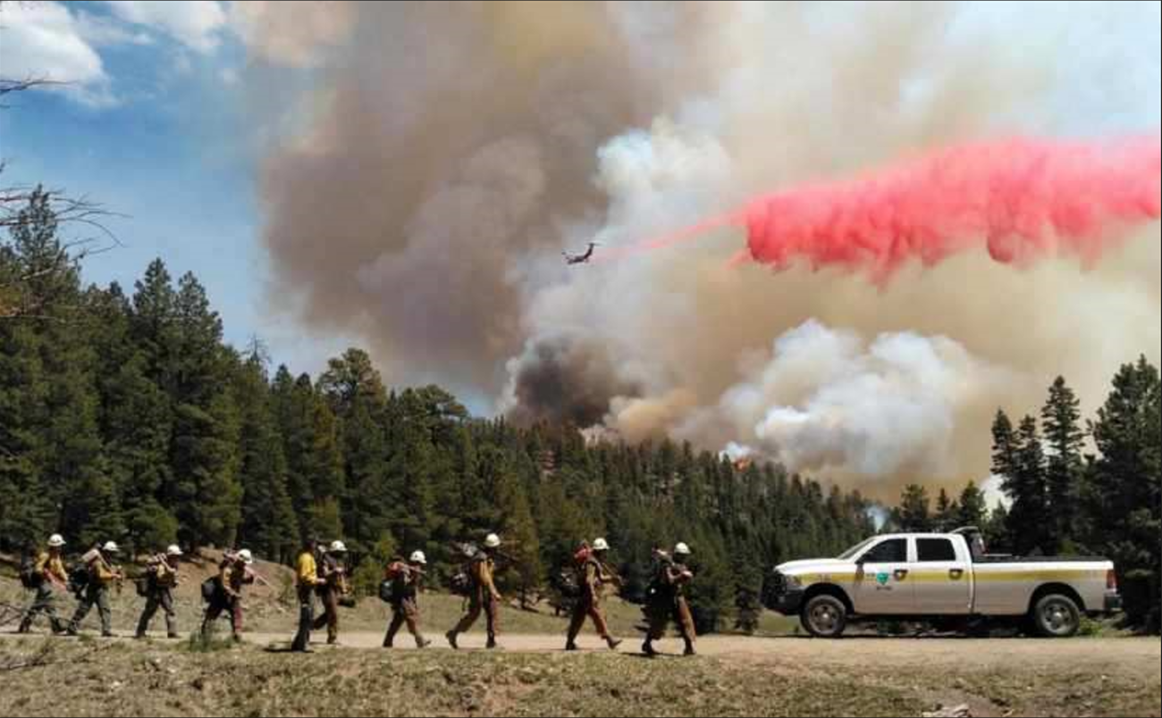 View of a firefighting crew in the Carson National Forest during the Midnight fire. A plane flies overhead and drops fire retardant to help control the fire.