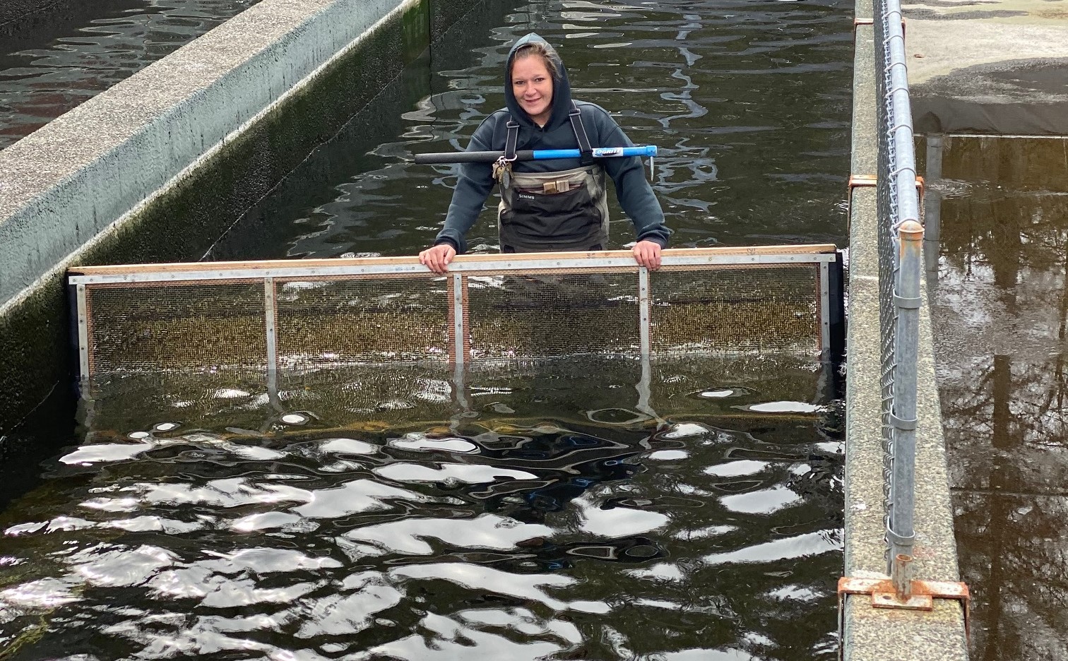 Jane Lemieux crowding salmon in a raceway (holding pond) during her days as a Tribal TERO employee.