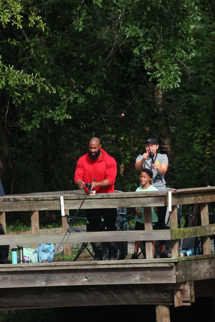 A family enjoys fishing from an accessible pier at Bogue Chitto National Wildlife Refuge.