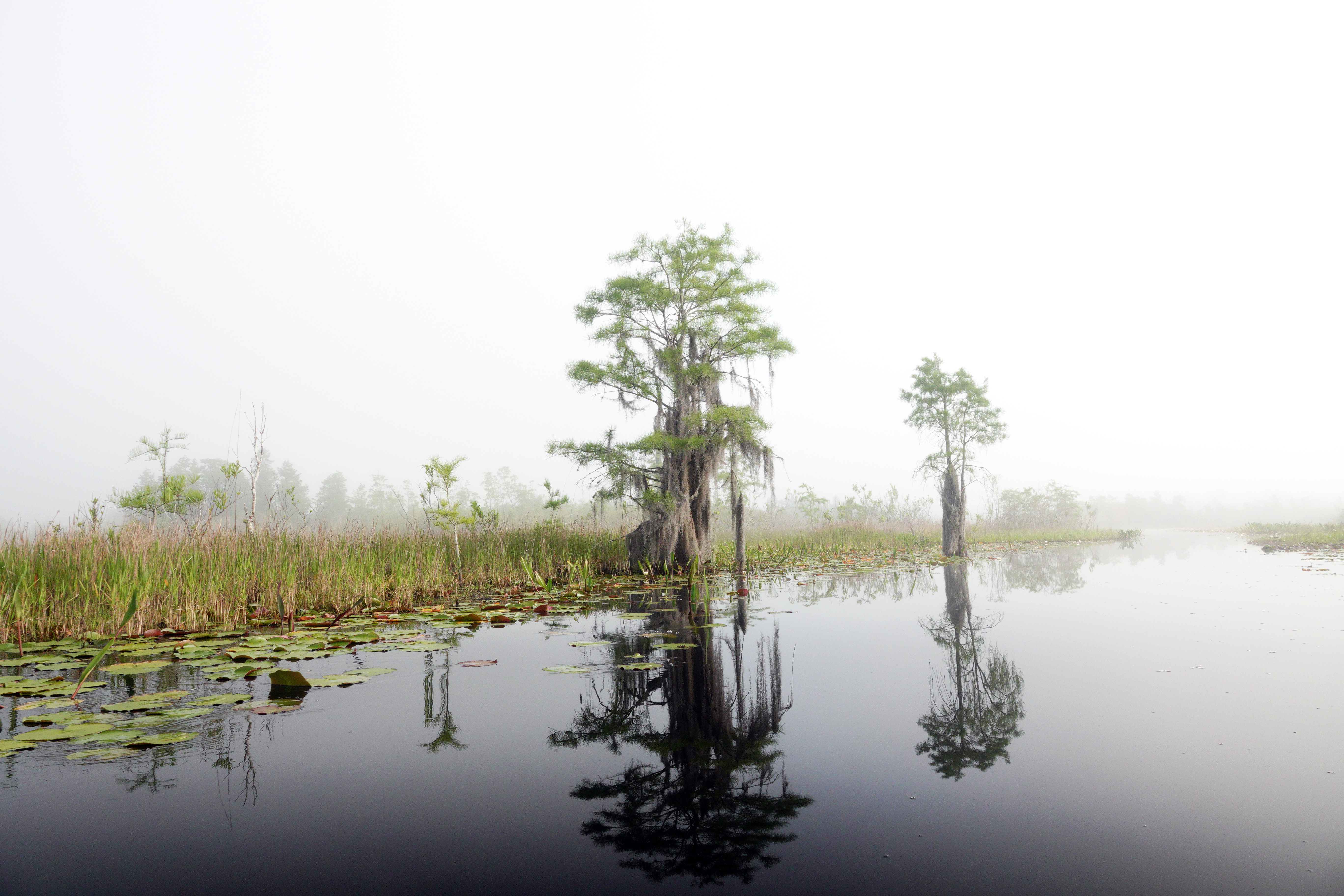 The waters of Okefenokee Swamp on a foggy day reflect cypress trees growing on the edges of a canal.