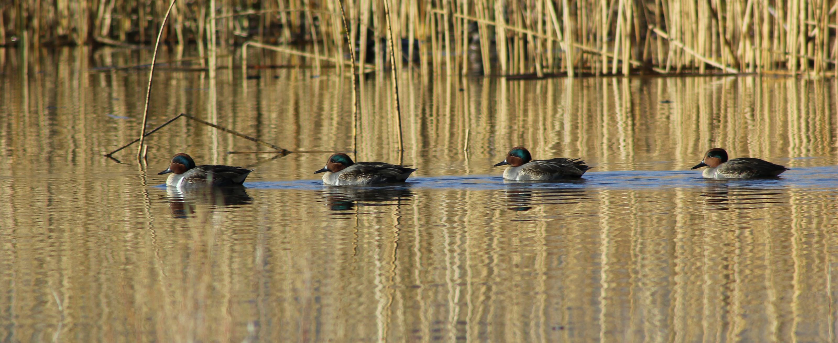 Four ducks swim in a line at Pahranagat Refuge in Nevada.