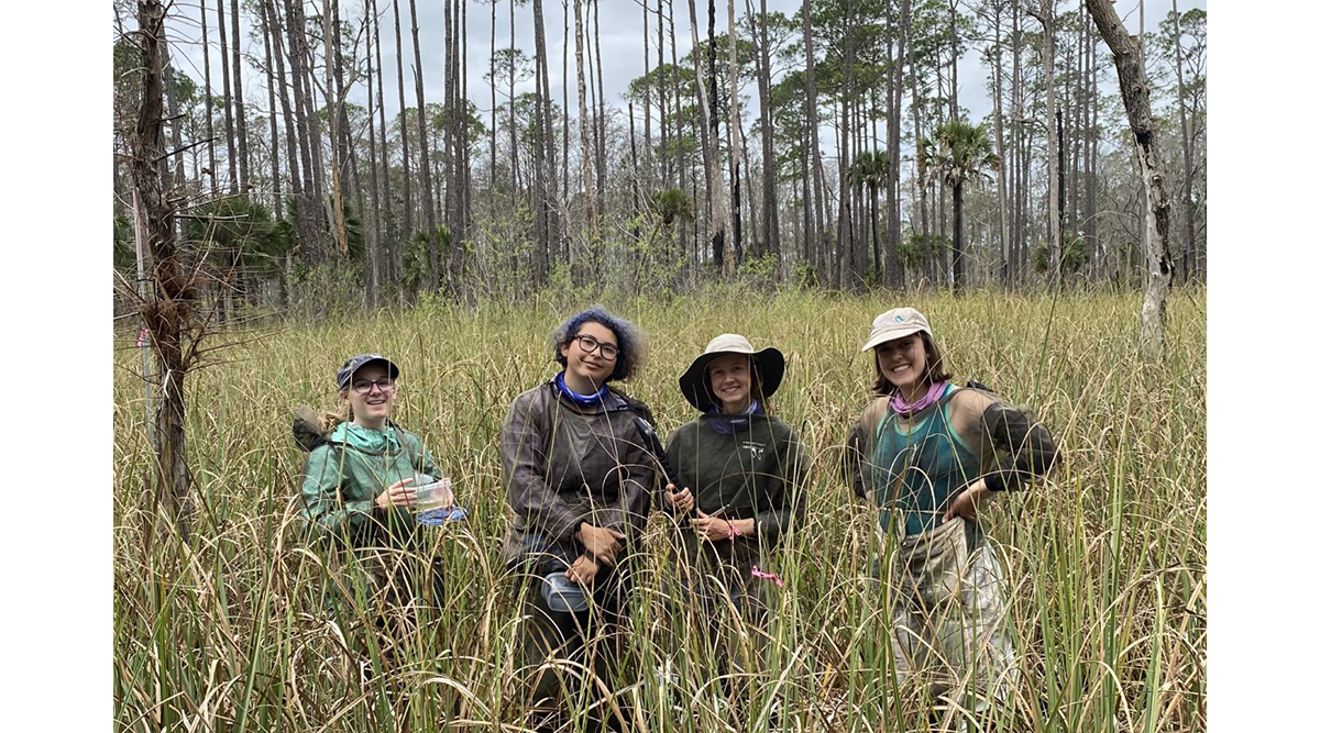 Interns Ella Shively, Olive Chen, Emma Jones, and Heather Poyner in the field at St. Marks National Wildlife Refuge in Florida.