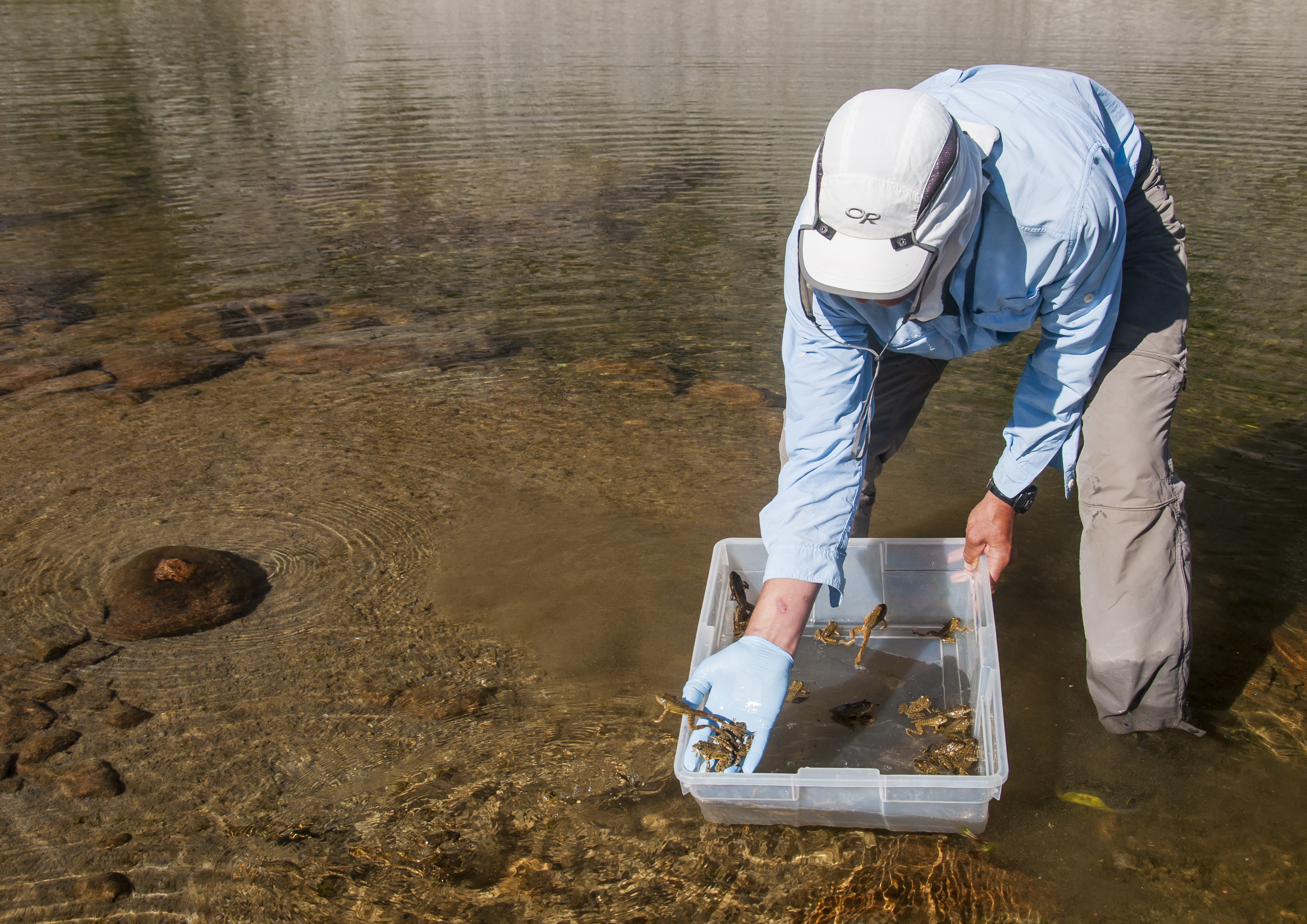 Tom Smith releases mountain yellow-legged frogs into the lake after being treated for Bd, a chytrid fungus that is killing millions of frogs around the world.