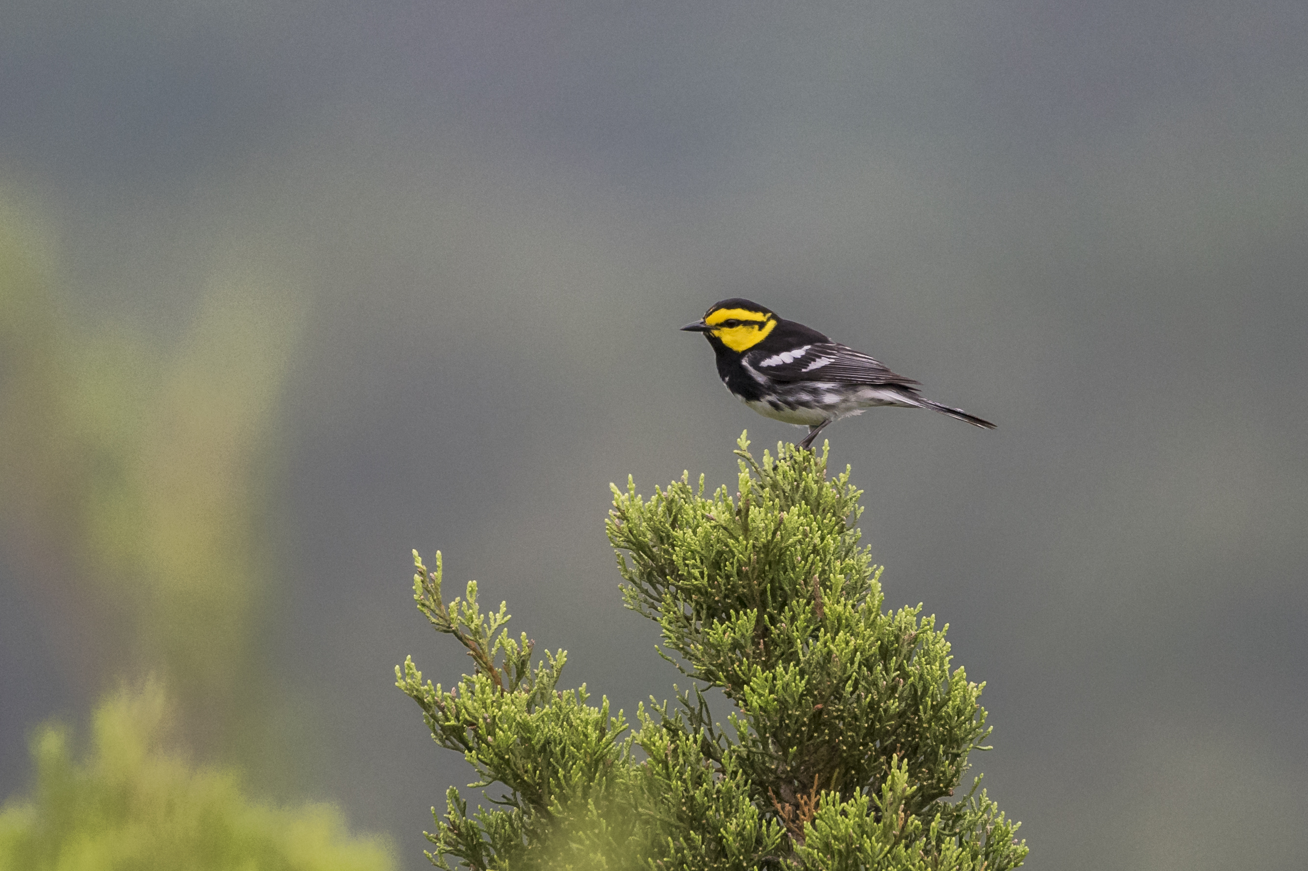 A golden-cheeked warbler perches on top of an Ashe juniper tree