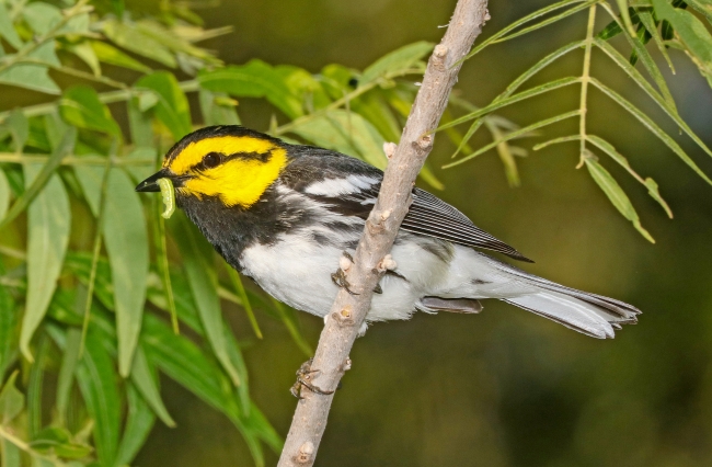 Golden-cheeked warbler with a worm in its beak