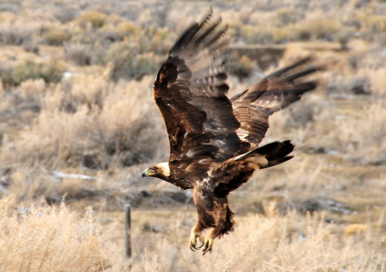 Mature golden eagle flys low over sagebrush steppe and greasewood in southern Wyoming.
