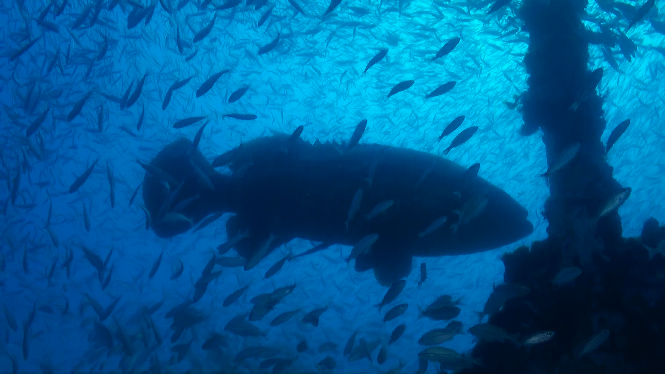 Small baitfish schools often use Goliaths as cover to stay safe from quicker predators.