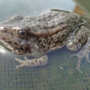 This gopher frog is sitting on an artificial lily pad in a tank at Edenton National Fish Hatchery. It is waiting to be released in the Croatan National Forest as part of a head start program. NC Wildlife Resources Commission, North Carolina State University's Center for Marine Sciences and Technology, and the US Forest Service are working together to boost numbers of this frog, now considered endangered by the state of North Carolina.