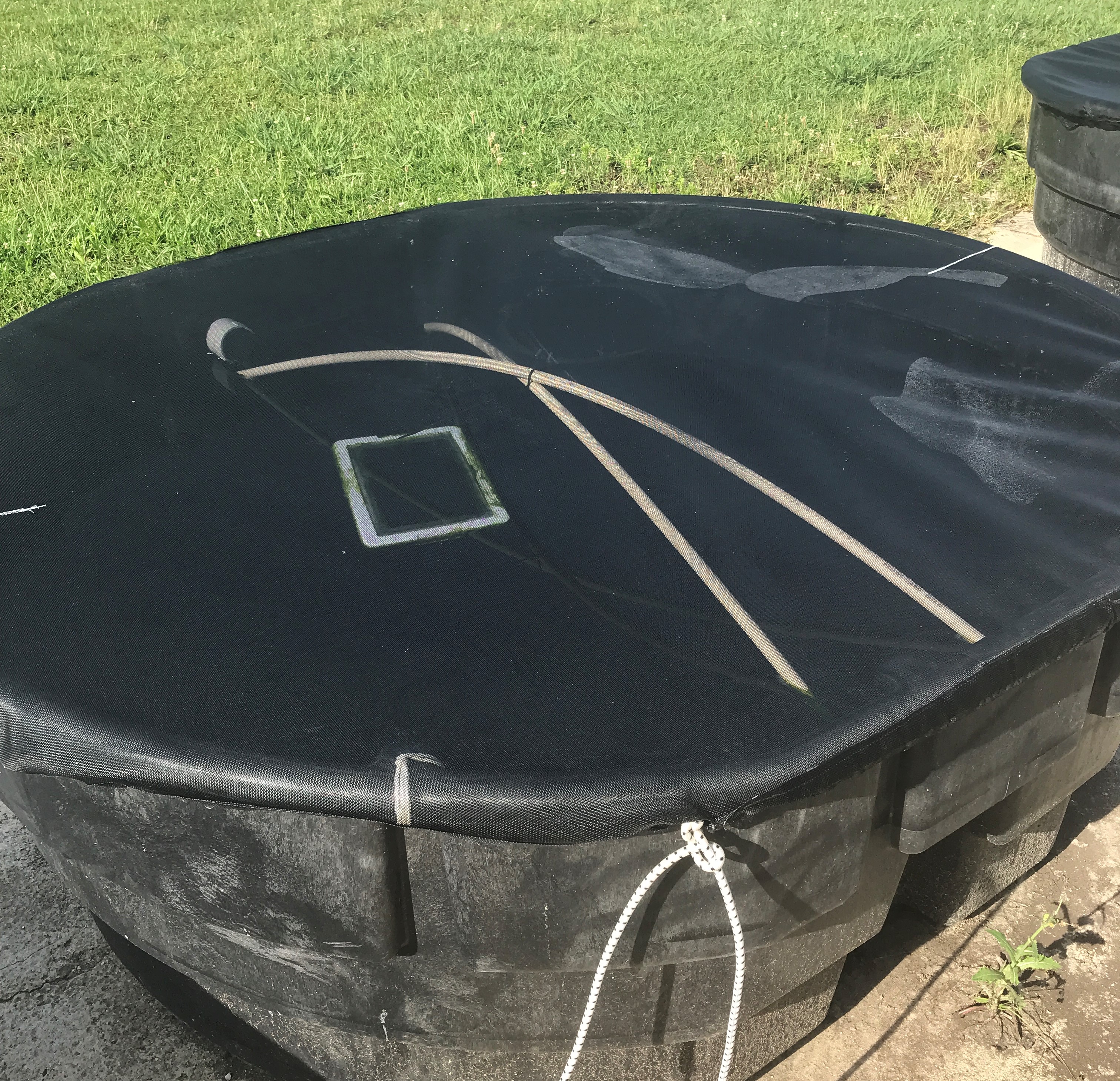 These tanks and covers at Edenton National Fish Hatchery protect young gopher frog tadpoles until they transform into frogs. The small rectangle floating in the water inside the tank is an artificial lily pad.