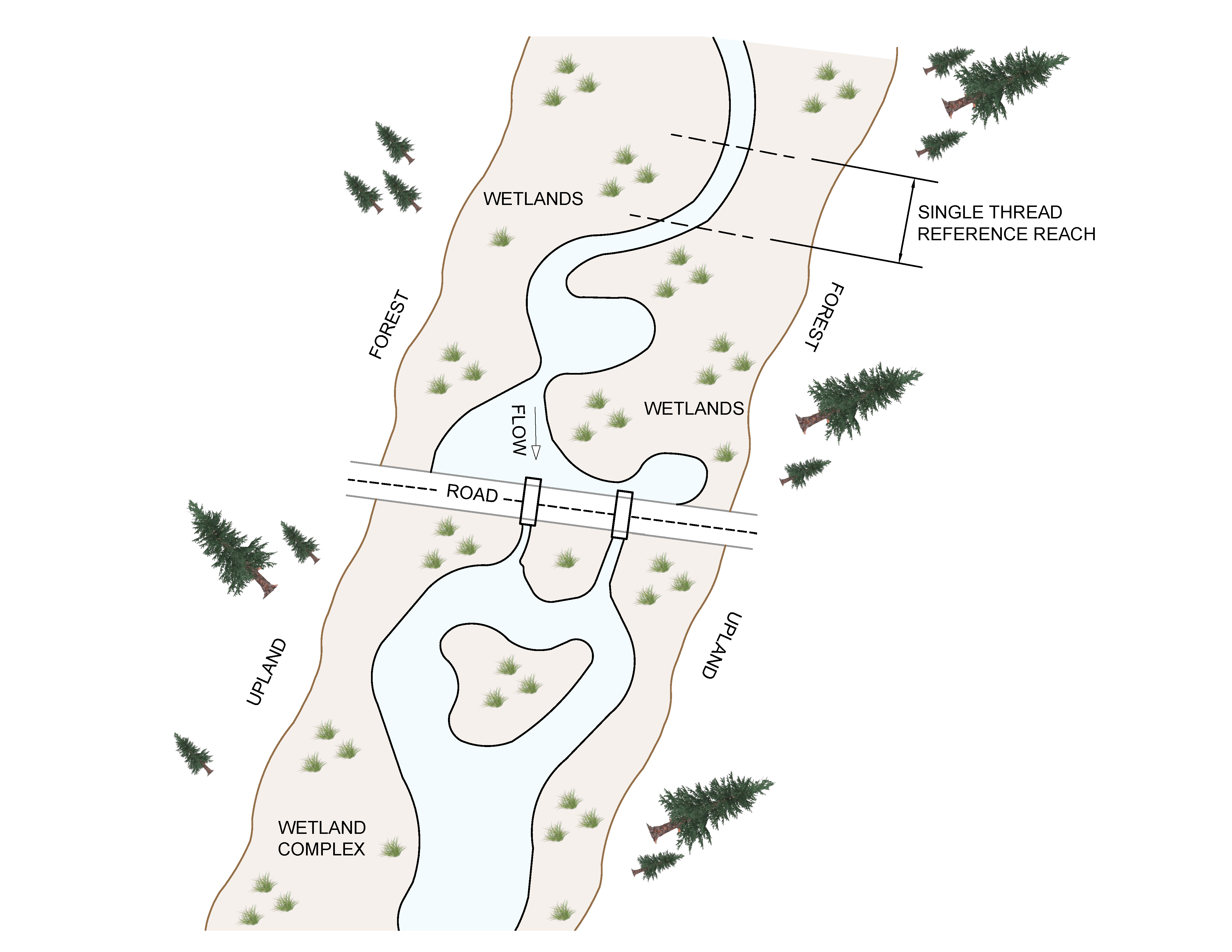 A plan view of a stream wetland complex with a road crossing the wetlands. There are two culverts allowing for flow across the road. A single thread reference reach is shown upstream of the wetlands. The forest and upland area is depicted outside of the wetlands.