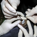 Biologist attached a radio telemetry transmitter to a gray bat.