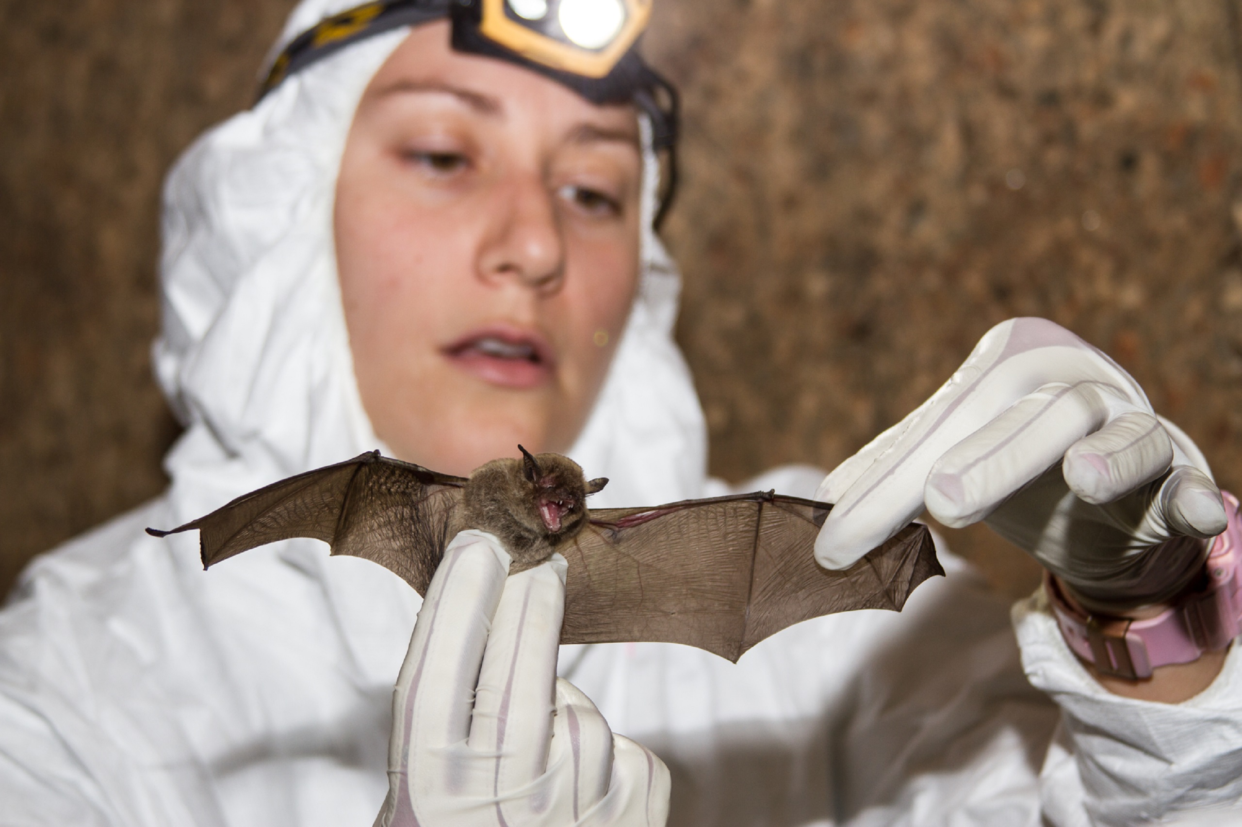 Biologist attached a radio telemetry transmitter to a gray bat,