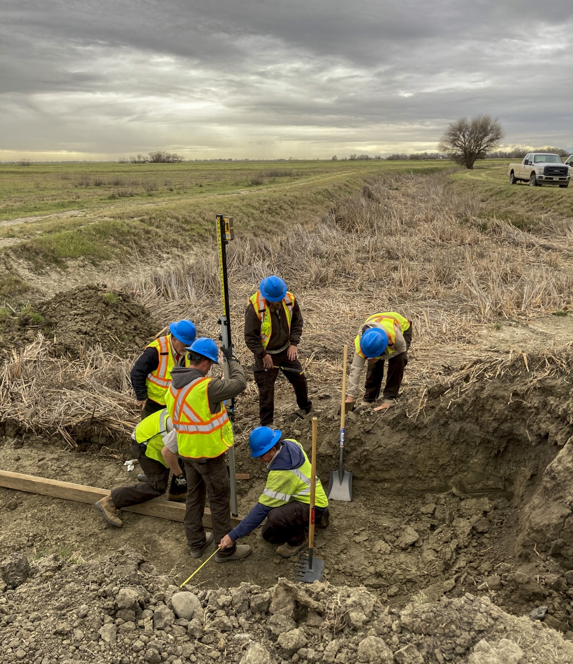 Great American Outdoors Act strike team, Trevor Browne, Jacob Geist, Trevor Morris, Macy Walsh and Danny Bowlin, receive training from Engineering Equipment Operator Brandon Jordan on water control structure replacement at San Luis National Wildlife Refuge in California.