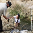 Michael Reeves (left) receives a green sunfish from Leah Simantel (middle, in the water, at Ash Meadows National Wildlife Refuge in Nevada. Green sunfish removal is crucial to the survival of the endangered Ash Meadows Amargosa pupfish.