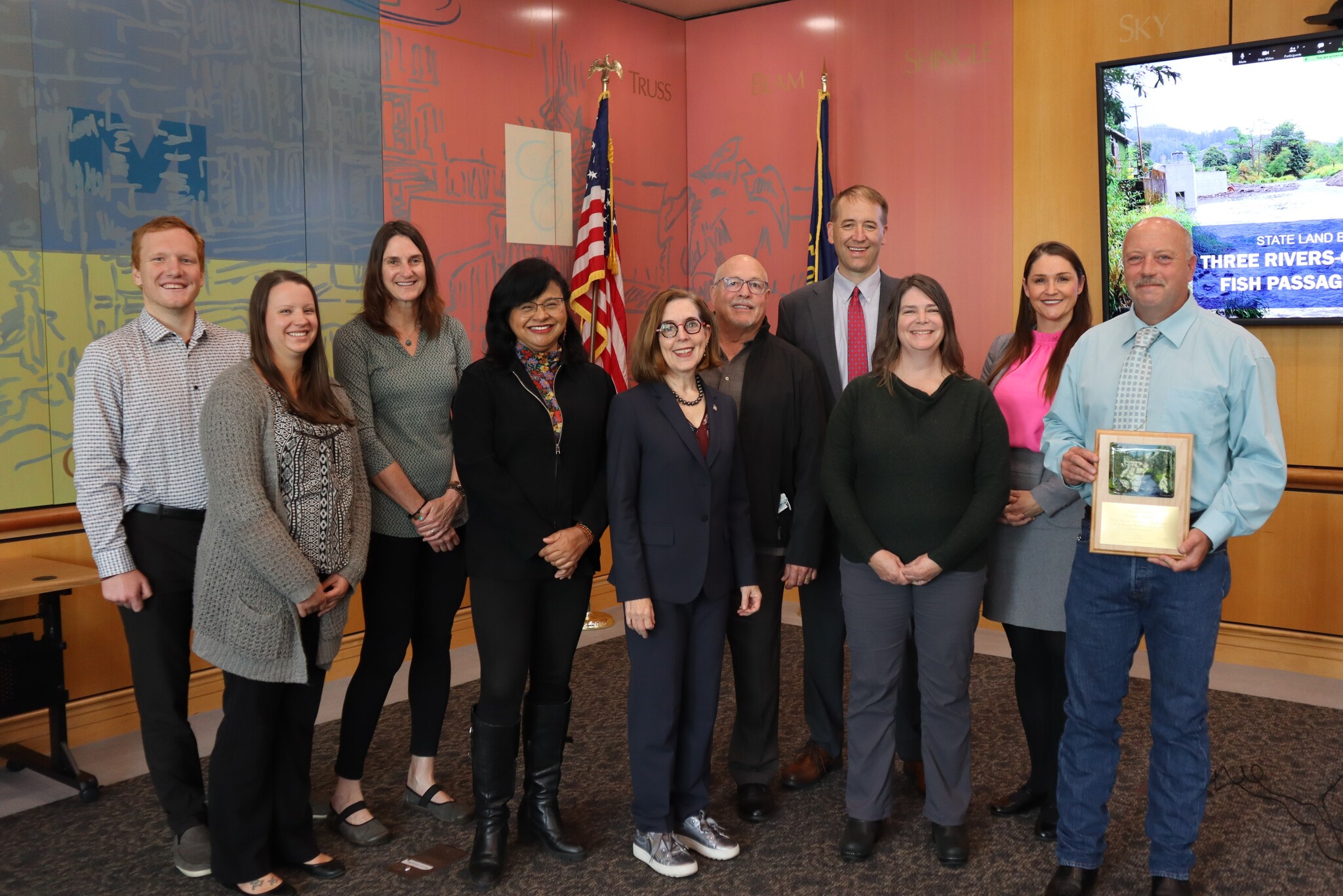 State Land Board Award ceremony from left to right: Carson List (U.S. Forest Service), Liz Ransom (Trout Unlimited), Amy Horstman (USFWS), Adriana Morales (U.S. Forest Service), Governor Kate Brown, Albert Knopf (Nestucca, Neskowin and Sand Lake Watershed Council), Oregon State Treasurer Tobias Read, Sarah Zwissler (Trout Unlimited), Oregon Secretary of State Shemia Fagan, Joel Watts (ODFW and 3 Rivers Project Designer). Oregon Department of State Lands Photo